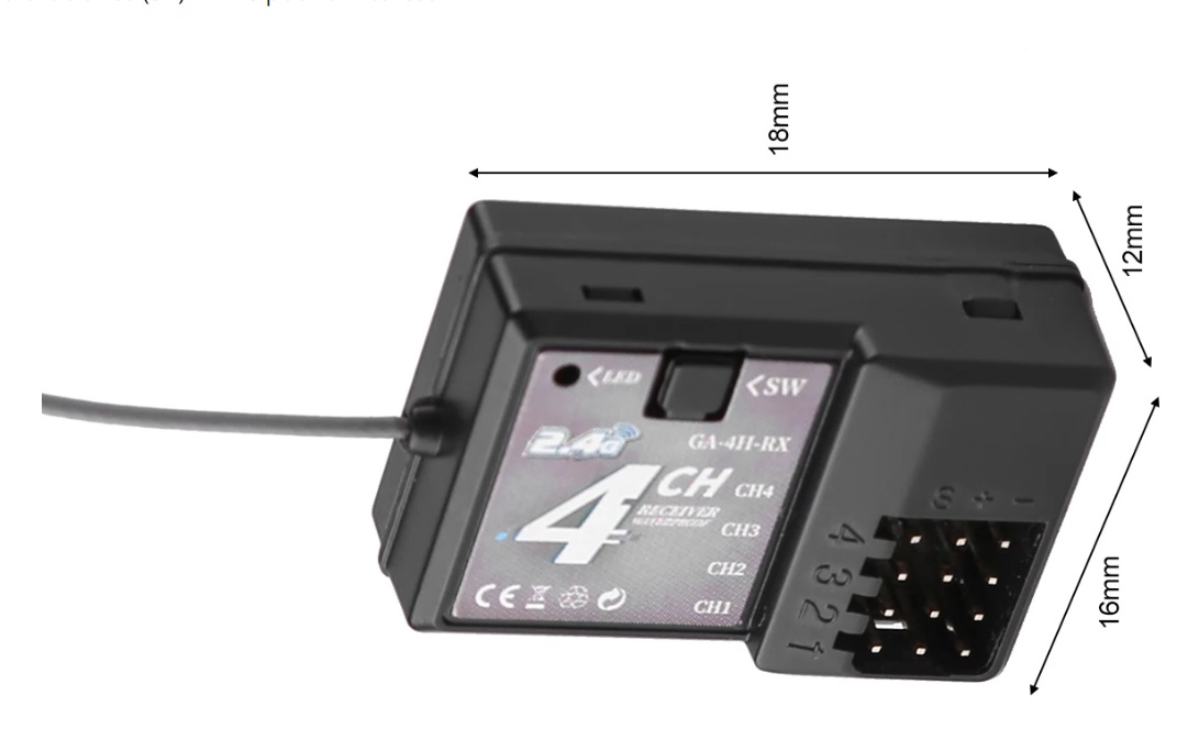 Özellikler: Alıcının tepki süresi 2ms olup hızlı tepki ve daha iyi kontrol sağlar. 3 kanalın her biri, 1 ve 2 kanallı karma kontrolü destekleyecek şekilde sırasıyla yapılandırılabilir. Alıcı voltaj aralığı. 3.3V-6V. Çalışma akımı 30mA, yüksek voltajlı servoları destekler. 2.4GHz Uzaktan Kumanda için 4 Kanallı Alıcı 1/8 1/10 1/16 1/32 RC Araba Tekne.